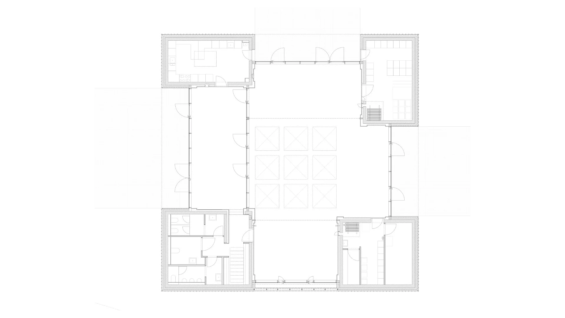 Die Saalfläche wird nur an den Ecken durch vier geschlossene Baukörper begrenzt, die alle untergeordneten Funktionen aufnehmen. Es entsteht ein zentraler von oben belichteter Raum, der durch vier nach außen orientierte Flügel behutsam gegliedert wird. Die geteilten Säle sind jeweils einem Flügel zugeordnet. Das Foyer besetzt den westlichen Flügel zur Hansjakobstraße und kann wie ein vierter Saal genutzt werden. Der kleinste südliche Flügel beherbergt den Sakralraum, der auch direkt vom Foyer zugänglich ist und im geöffneten Zustand ähnlich einer Seitenkapelle ablesbar bleibt.